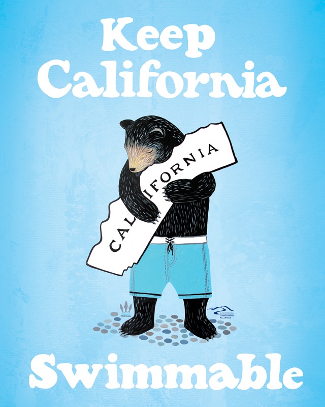 (サンフランシスコの)オーシャン・ビーチの近くに住む夫婦のチーム〈3 Fish Studios〉のデザインによる「Keep California Swimmable(カリフォルニアを泳げる状態に保とう)」ポスター。オンラインでのプリントの売り上げは〈California Coastkeeper Alliance〉に寄付される。